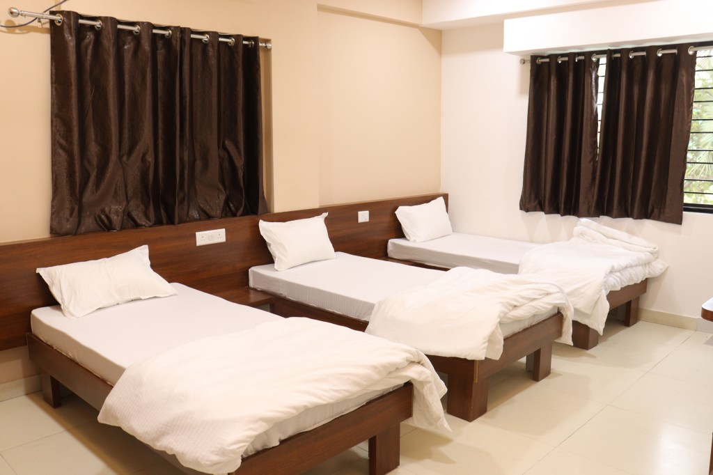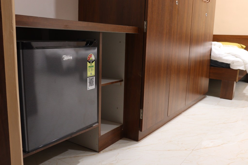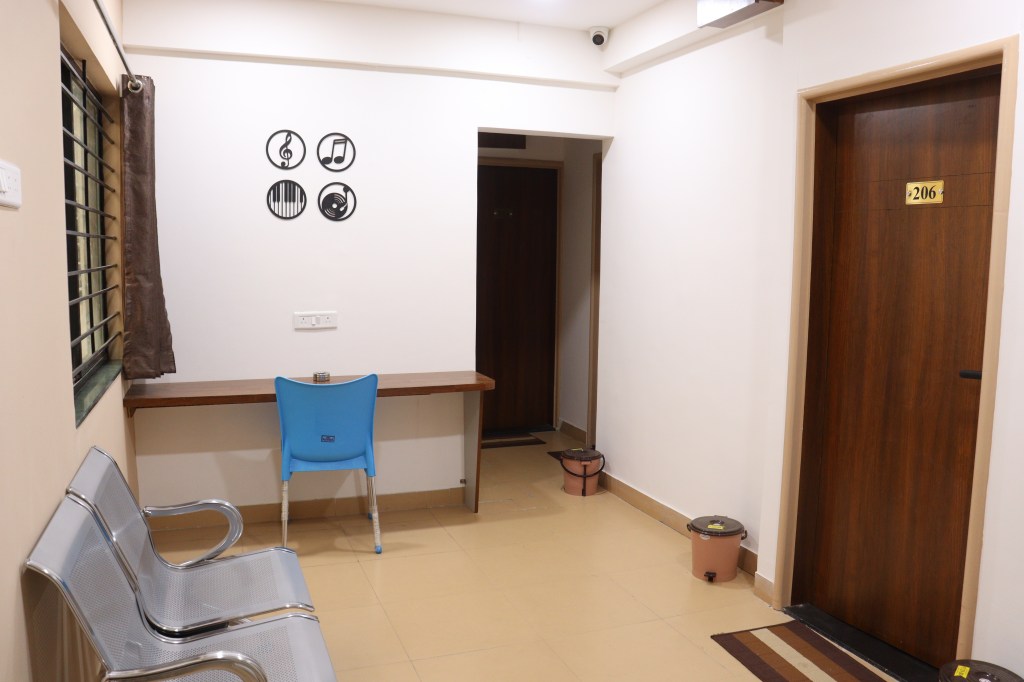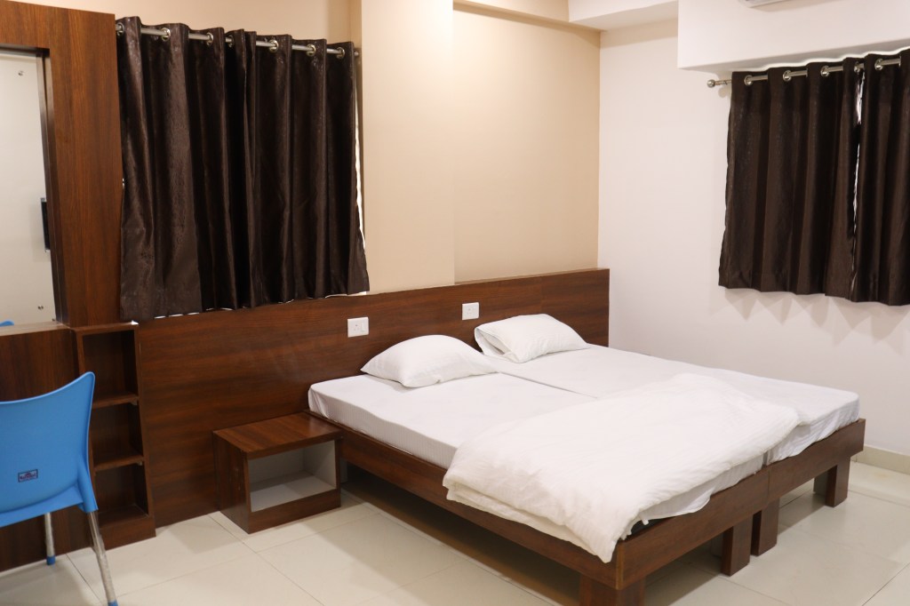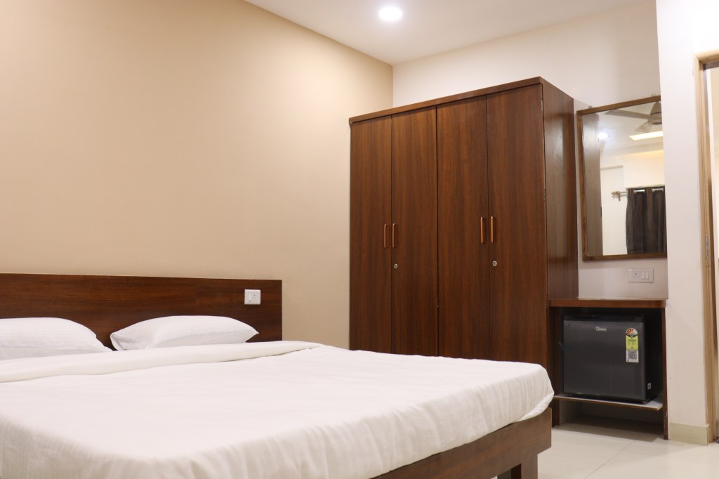 We have practically all facilities like Split AC, TV, Beds with Mattresses, Wardrobes, Mini Fridge in all rooms, Tea/Coffee maker in all rooms, attached washrooms with installed boiler of 10L capacity, Study unit, Bag Tops, Area for Chappals/Shoes, well designed and appealing interior with false ceiling in all rooms with led lightings, RFID operated main door locks, common areas on each floor where clients can meet and chitchat, ample parking facilities, 24 hours resident care taker, security round the clock, kitchen facility for guests staying for long duration, 300 mbps Wifi, entire area is covered with 19 cctv cameras installed.